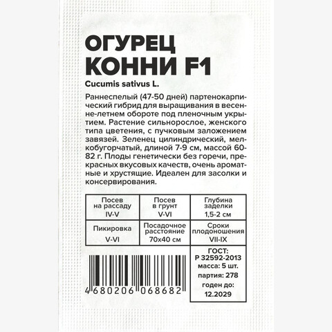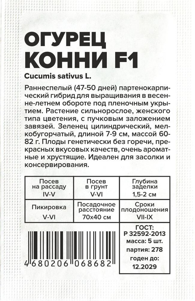 Раннеспелый (47-50 дней) партенокарпический гибрид для выращивания в весенне-летнем обороте под пленочным укрытием. Растение сильнорослое, женского типа цветения, с пучковым заложением завязей. Зеленец цилиндрический, мелкобугорчатый, длиной 7-9 см, массой 60-82 г. Плоды генетически без горечи, прекрасных вкусовых качеств, очень ароматные и хрустящие. Идеален для засолки и консервирования. Гибрид устойчив к вирусу огуречной мозаики, оливковой пятнистости, настоящей мучнистой росе. Неприхотлив в неблагоприятных погодных условиях. Место посадки: предпочитает плодородные рыхлые нейтральные почвы. Размещают после капусты, лука, бобовых. Не рекомендуется сеять после других растений семейства тыквенных (тыква, огурец, кабачок, арбуз) Освещение: обильное, переносит легкое затенение Предпосевная подготовка: семена замачивают в 0,5% растворе марганцовки на 15 минут. Допускается предварительное проращивание во влажной ткани или посев сухими семенами без подготовки. Инкрустированные (цветные) семена сеют сухим способом, без замачивания и подготовки Сроки посева: на рассаду за 20-25 дней до высадки (апрель-май), в открытый грунт после прогревания почвы до 15..18°С на глубине 15 см (май-июнь) Посев на рассаду: семена раскладывают на выровненный уплотненный теплый очень влажный грунт в рассадные ящики или индивидуальные емкости объемом 0,5 л. Присыпают слоем почвы 0,8-1 см и хорошо уплотняют, аккуратно поливают теплой водой, накрывают пленкой. Пророщенные семена присыпают рыхлым грунтом без уплотнения Посев в грунт: высевают, когда почва прогреется до 15-20°С. Семена раскладывают на уплотненной и хорошо увлажненной почве, заделывают землей на глубину 1,5-2,0 см, хорошо увлажняют, уплотняют и накрывают пленкой Пикировка/перевалка: в остекленные или пленочные теплицы, тоннели высаживают 20-25-дневную рассаду, имеющую 3-5 настоящих листьев. Схема посадки 70х40 см с использованием шпалер Уход: почва под растениями всегда должна оставаться увлажненной. Подкормки проводят при наличии симптомов дефицитов питания. При выращивании в теплице необходимо обеспечивать проветривание. Не требуют формировки