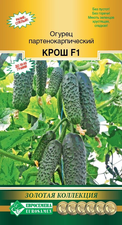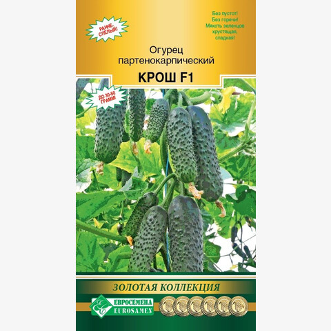 Огурец – ценный низкокалорийный продукт (14 ккал на 100 г). Витаминная составляющая овоща не очень выразительна. Это натуральное очищающее вещество, по спектру действия напоминающее активированный уголь. Крош - раннеспелый партенокарпический гибрид огурца женского типа цветения для выращивания в открытом и защищенном грунте, а также в комнатной культуре. В плодоношение растения вступают спустя 39-42 дня с момента всходов. Огурцы отличаются компактным габитусом: короткоплетистые, маловетвистые, с небольшими листовыми пластинами. В узле каждого листа формируется по 3-5 завязей. Плоды короткие, цилиндрической формы, тёмно-зелёного цвета, крупнобугорчатые, малошипые. Огурчики длиной 7-10 см, диаметром 3,0-4,5 см и массой 30-50 г, долго не перерастают. Мякоть зеленцев плотная, хрустящая, сладкая и ароматная, без пустот и без горечи, кожица тонкая. Данный огурец отличается очень ранним вступлением в плодоношение, ценится за длительную отдачу урожая, теневыносливость и устойчивость к заболеваниям огурца. Плотность посадки — 4-5 растений/м².