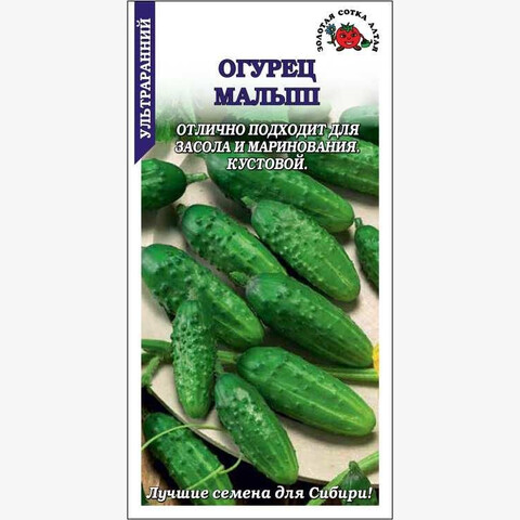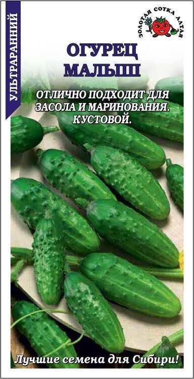 Ультраранний урожайный сорт. От всходов до начала плодоношения 41-43 дня. Растение кустовое, компактное, слабоветвистое. Зеленцы эллипсовидной формы, длиной 9-9,5 см, крупно- и редкобугорчатые, темно-зеленые с полосами, плотные и хрустящие, отличного вкуса. Сорт прекрасно подходит для засола и маринования, приготовления малосольных огурчиков и свежего потребления.