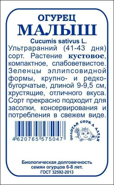• Ультраранний урожайный сорт. От всходов до начала плодоношения 41-43 дня. Растение кустовое, компактное, слабоветвистое. Зеленцы эллипсовидной формы, длиной 9-9,5 см, крупно- и редкобугорчатые, темно-зеленые с полосами, плотные и хрустящие, отличного вкуса. Сорт прекрасно подходит для засола и маринования, приготовления малосольных огурчиков и свежего потребления.