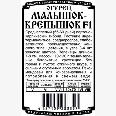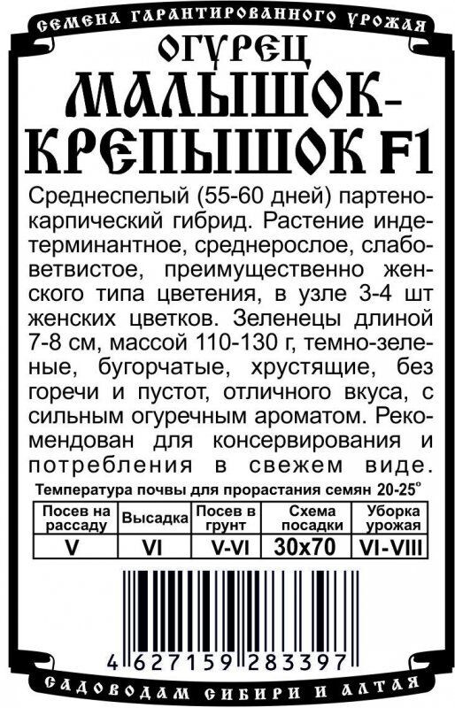 Среднеспелый (55-60 дней) партенокарпический гибрид. Растение индетерминантное, среднерослое, слабоветвистое, преимущественно женского типа цветения, в узле 3-4 шт женских цветков. Зеленецы длиной 7-8 см, массой 110-130 г, темно-зеленые, бугорчатые, хрустящие, без горечи и пустот, отличного вкуса, с сильным огуречным ароматом. Рекомендован для консервирования и потребления в свежем виде.