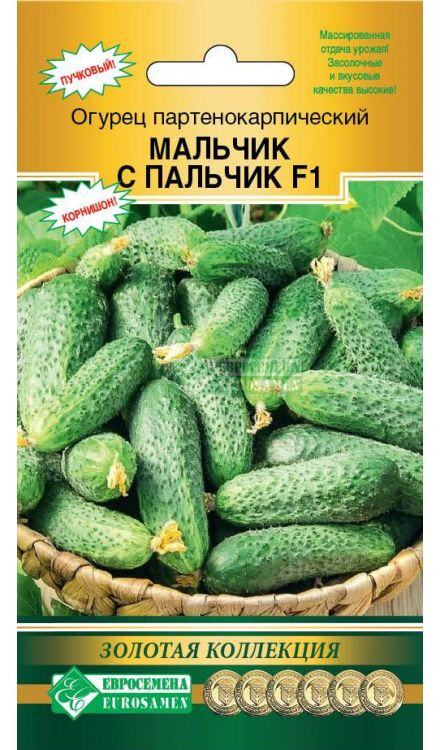 Огурец – ценный низкокалорийный продукт (14 ккал на 100 г). Витаминная составляющая овоща не очень выразительна. Большая часть ингредиентного состава приходится на воду (95 %), в которой находится природный адсорбент, впитывающий и выводящий яды из организма. Это натуральное очищающее вещество, по спектру действия напоминающее активированный уголь. Мальчик с пальчик - скороспелый пучковый корнишонный гибрид женского типа цветения для открытого грунта, весенних теплиц и тоннелей. Выделяется обилием зеленцов на плетях, массированной отдачей урожая. Ветвление среднее или выше среднего. В узлах формируется от 2-3 до 5-6 завязей. Зеленцы бугорчатые, белошипые, ярко-зеленого цвета, длиной 8-10 см. Шипы не колючие! Засолочные и вкусовые качества высокие. Растения светолюбивые, вступают в плодоношение на 37-39-й день от всходов. Гибрид устойчив к мучнистой росе, оливковой пятнистости, вирусу обыкновенной огуречной мозаики, толерантен к ложной мучнистой росе.