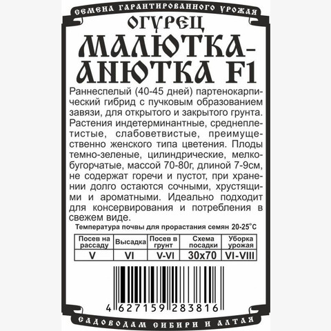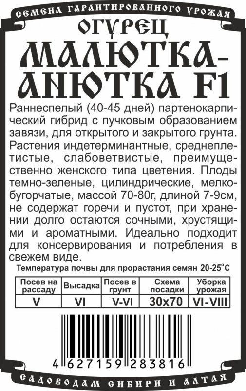 Раннеспелый (40-45 дней) партенокарпический гибрид с пучковым образованием завязи, для открытого и закрытого грунта. Растения индетерминантные, среднеплетистые, слабоветвистые, преимущественно женского типа цветения. Плоды темно-зеленые, цилиндрические, мелкобугорчатые, массой 70-80г, длиной 7-9см, не содержат горечи и пустот, при хранении долго остаются сочными, хрустящими и ароматными. Идеально подходит для консервирования и потребления в свежем виде.
