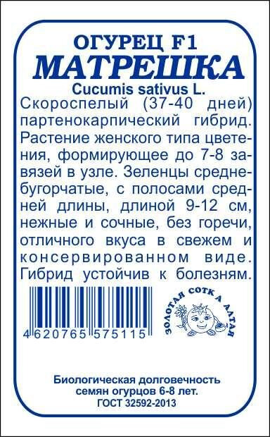 Скороспелый партенокарпический гибрид. От всходов до созревания 37-40 дней. Растение женского типа цветения, при достаточном питании формирует до 7-8 завязей в узле. Зеленцы овальные, длиной 9-12 см, среднебугорчатые, слаборебристые, крепкие и хрустящие, нежные, сочные, отличного вкуса, без горечи. Гибрид холодостойкий и высокоурожайный, устойчив к ряду заболеваний. Прекрасно подходит для засола и маринования, непосредственного потребления и приготовления салатов.