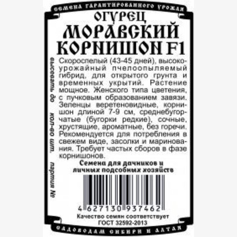 Скороспелый (43-45 дней), высокоурожайный пчелоопыляемый гибрид, женского типа цветения с пучковым образованием завязи, для открытого грунта и временных укрытий. Растение мощное. Зеленцы веретеновидные, корнишон длиной 7-9 см, массой 68-94 гр, среднебугорчатые (бугорки редкие), сочные, хрустящие, ароматные, без горечи. Рекомендуется для потребления в свежем виде, засолки и маринования. Требует частых сборов в фазе корнишонов.