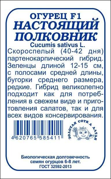 Скороспелый партенокарпический гибрид, устойчивый к ряду заболеваний. От всходов до плодоношения 40-42 дня. Растение сильнорослое, средневетвистое, женского типа цветения с дружной отдачей урожая. Зеленцы веретеновидные, длиной 12-15 см, зеленые с полосами средней длины, бугорки среднего размера, редкие. Мякоть сочная, нежная и ароматная. Гибрид великолепно подходит как для непосредственного потребления и приготовления салатов, так и для всех видов консервирования.