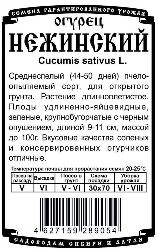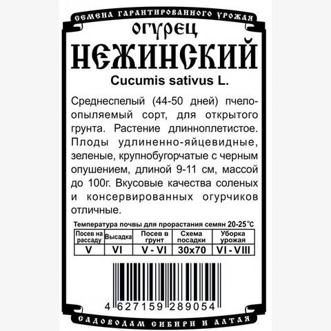 Среднеспелый (44-50 дней) пчелоопыляемый сорт, для открытого грунта. Растение длинноплетистое. Плоды удлиненно-яйцевидные, зеленые, крупнобугорчатые с черным опушением, длиной 9-11 см, массой до 100г. Вкусовые качества соленых и консервированных огурчиков отличные.