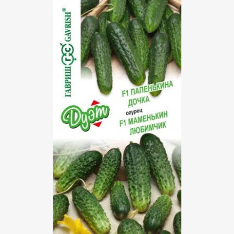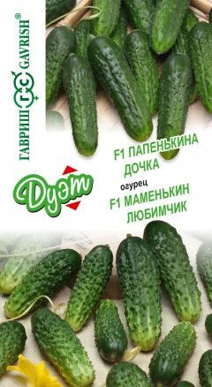 Огурец Папенькина Дочка: Скороспелый (40-43 дня от всходов до плодоношения) партенокарпический гибрид с букетным заложением завязей (2-3 в узле) для выращивания в теплицах, под временными пленочными укрытиями, на балконах и лоджиях. Плоды цилиндрические, длиной 12-14 см, диаметром 3,5-4,0 см, массой 130-150 г, темно-зеленые, с бугорками среднего размера, белошипые. Гибрид дает высокие урожаи даже при неблагоприятных условиях выращивания. Устойчив к настоящей мучнистой росе, оливковой пятнистости, среднеустойчив к ложной мучнистой росе.