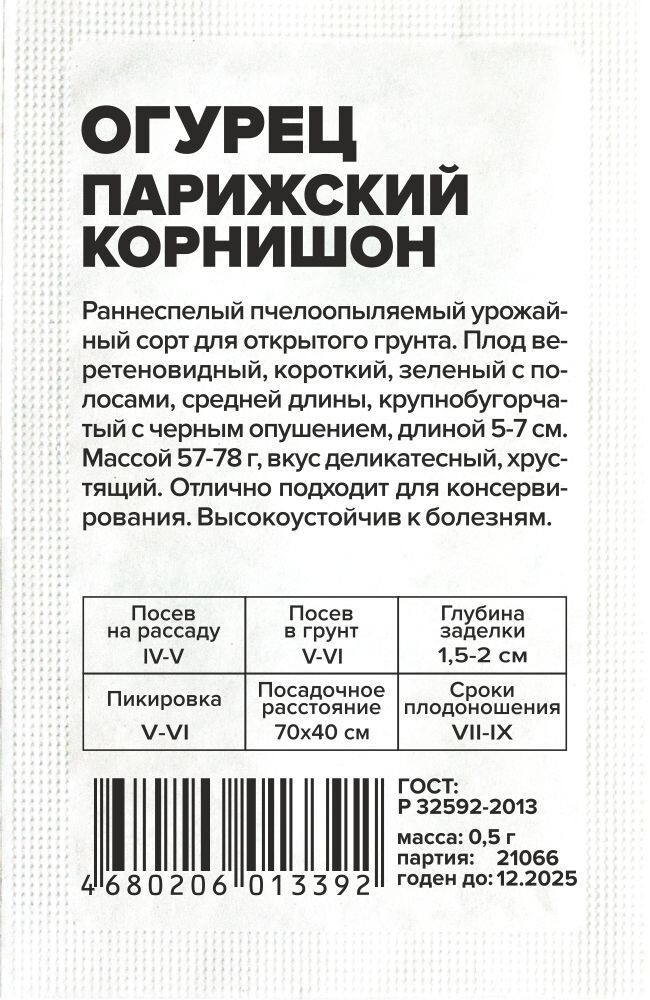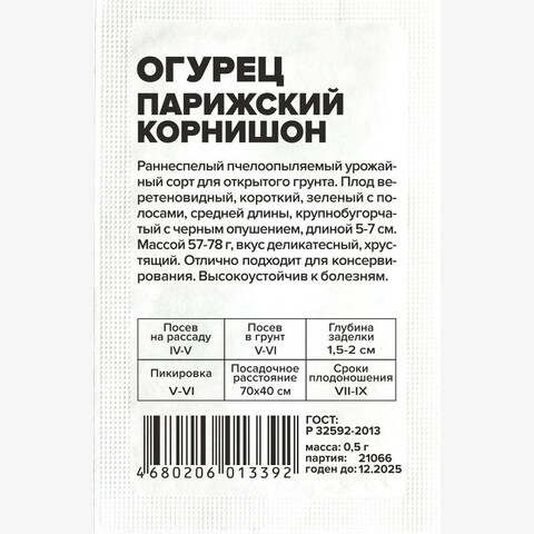 Раннеспелый пчелоопыляемый урожайный сорт для открытого грунта. Плод веретеновидный, короткий, зеленый с полосами, средней длины, крупнобугорчатый с черным опушением, длиной 5-7 см. Массой 57-78 г, вкус деликатесный, хрустящий. Отлично подходит для консервирования. Высокоустойчив к болезням. Место посадки: предпочитает плодородные рыхлые нейтральные почвы. Размещают после капусты, лука, бобовых. Не рекомендуется сеять после других растений семейства тыквенных (тыква, огурец, кабачок, арбуз) Освещение: обильное, переносит легкое затенение Предпосевная подготовка: семена замачивают в 0,5% растворе марганцовки на 15 минут. Допускается предварительное проращивание во влажной ткани или посев сухими семенами без подготовки. Инкрустированные (цветные) семена сеют сухим способом, без замачивания и подготовки Сроки посева: на рассаду за 20-25 дней до высадки (апрель-май), в открытый грунт после прогревания почвы до 15..18°С на глубине 15 см (май-июнь) Посев на рассаду: семена раскладывают на выровненный уплотненный теплый очень влажный грунт в рассадные ящики или индивидуальные емкости объемом 0,5 л. Присыпают слоем почвы 0,8-1 см и хорошо уплотняют, аккуратно поливают теплой водой, накрывают пленкой. Пророщенные семена присыпают рыхлым грунтом без уплотнения Посев в грунт: высевают, когда почва прогреется до 15-20°С. Семена раскладывают на уплотненной и хорошо увлажненной почве, заделывают землей на глубину 1,5-2,0 см, хорошо увлажняют, уплотняют и накрывают пленкой Пикировка/перевалка: высадка проводится в открытый грунт или хорошо проветриваемые теплицы с доступом насекомых – опылителей. Схема посадки 70х40 см Уход: растения прищипывают после 5-7 настоящего листа. Почва под растениями всегда должна оставаться увлажненной. Подкормки проводят при наличии симптомов дефицитов питания. При выращивании в теплице необходимо обеспечивать проветривание