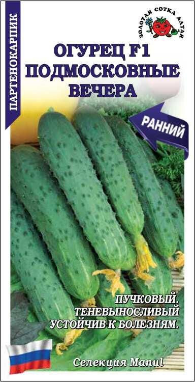 • Ранний партенокарпический гибрид. От всходов до плодоношения 42-45 дней. Растение сильноплетистое, преимущественно женского типа цветения. Зеленцы цилиндрические, темно-зеленые, бугорчатые (бугорки редкие), длиной 12-14 см, нежные и сочные, обладают превосходным вкусом в свежем виде, великолепны в засолке. Гибрид ценится за склонность к пучковому заложению завязей, продолжительную отдачу урожая и высокое качество плодов, устойчивость к болезням и теневыносливость.