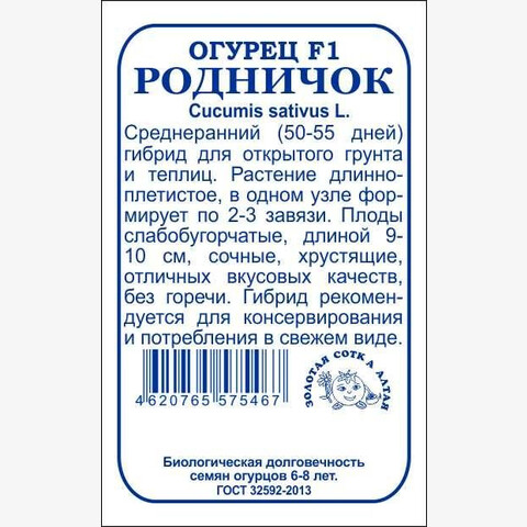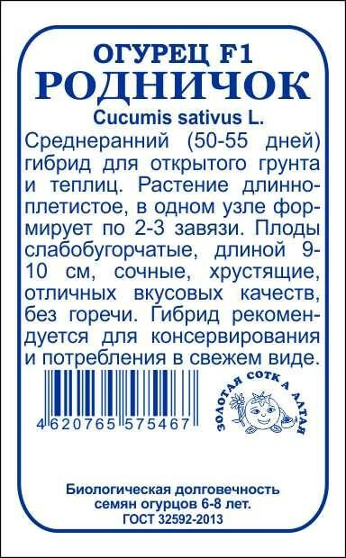 Среднеранний гибрид для открытого грунта и теплиц. От всходов до начала плодоношения 50-55 дней. Растение длинноплетистое, в одном узле формируется 2-3 завязи. Плоды цилиндрические, слабобугорчатые, длиной 9-10 см, высоких вкусовых качеств, без горечи. Гибрид прекрасно подходит для непосредственного потребления, приготовления салатов, засолки и маринования.