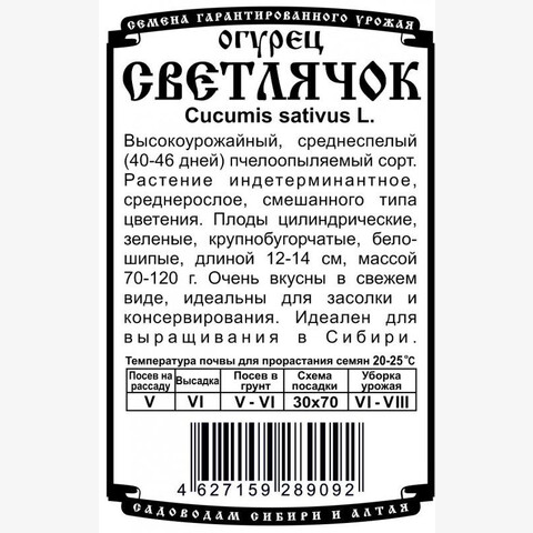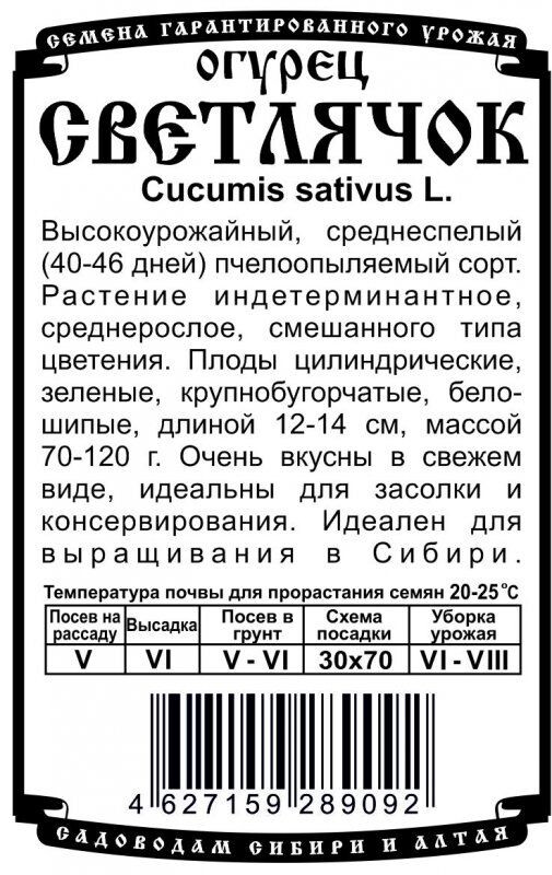 Высокоурожайный, среднеспелый (40-46 дней) пчелоопыляемый сорт. Растение индетерминантное, среднерослое, смешанного типа цветения. Плоды цилиндрические, зеленые, крупнобугорчатые, белошипые, длиной 12-14 см, массой 70-120г. Очень вкусны в свежем виде, идеальны для засолки и консервирования. Идеален для выращивания в Сибири.