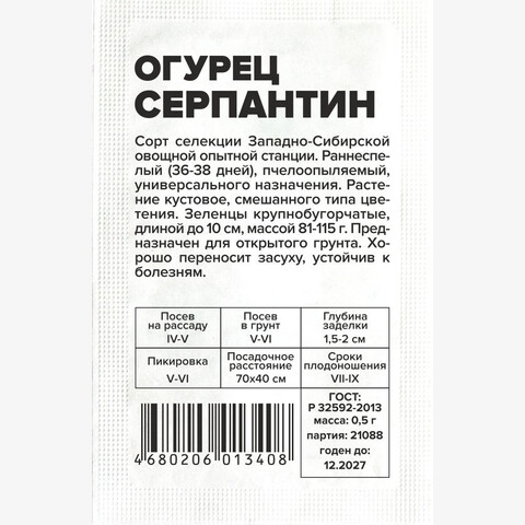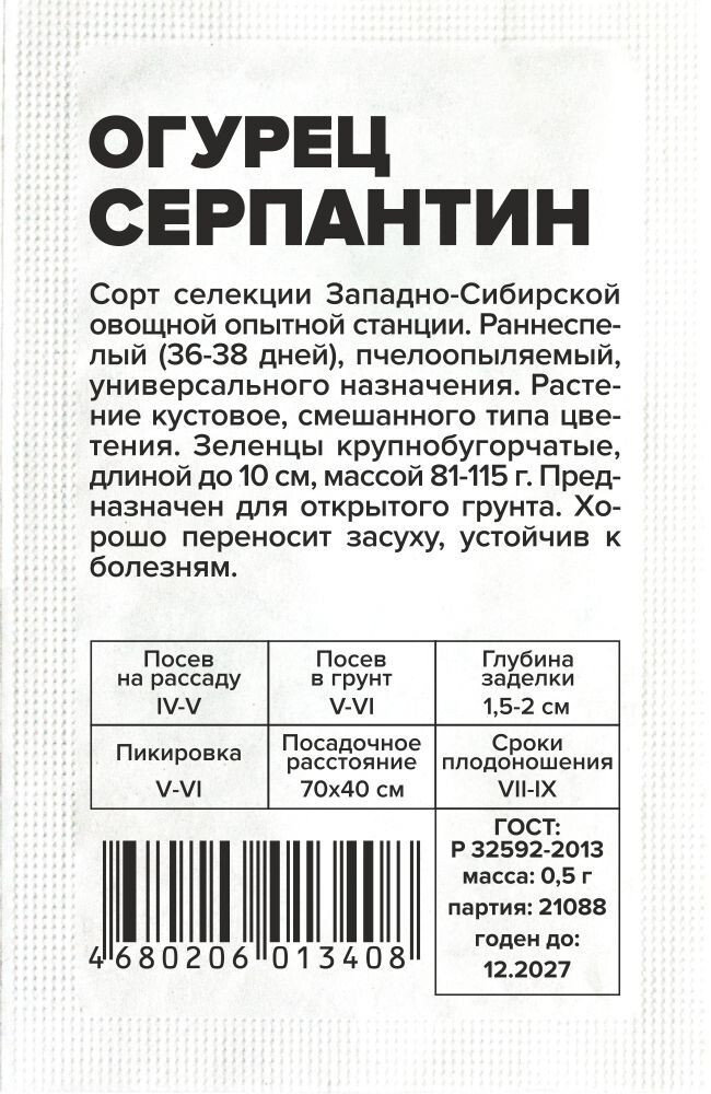 Сорт селекции Западно-Сибирской овощной опытной станции. Раннеспелый (36-38 дней), пчелоопыляемый, универсального назначения. Растение кустовое, смешанного типа цветения. Зеленцы крупнобугорчатые, длиной до 10 см, массой 81-115 г. Предназначен для открытого грунта. Хорошо переносит засуху, устойчив к болезням. Место посадки: предпочитает плодородные рыхлые нейтральные почвы. Размещают после капусты, лука, бобовых. Не рекомендуется сеять после других растений семейства тыквенных (тыква, огурец, кабачок, арбуз) Освещение: обильное, переносит легкое затенение Предпосевная подготовка: семена замачивают в 0,5% растворе марганцовки на 15 минут. Допускается предварительное проращивание во влажной ткани или посев сухими семенами без подготовки. Инкрустированные (цветные) семена сеют сухим способом, без замачивания и подготовки Сроки посева: на рассаду за 20-25 дней до высадки (апрель-май), в открытый грунт после прогревания почвы до 15..18°С на глубине 15 см (май-июнь) Посев на рассаду: семена раскладывают на выровненный уплотненный теплый очень влажный грунт в рассадные ящики или индивидуальные емкости объемом 0,5 л. Присыпают слоем почвы 0,8-1 см и хорошо уплотняют, аккуратно поливают теплой водой, накрывают пленкой. Пророщенные семена присыпают рыхлым грунтом без уплотнения Посев в грунт: высевают, когда почва прогреется до 15-20°С. Семена раскладывают на уплотненной и хорошо увлажненной почве, заделывают землей на глубину 1,5-2,0 см, хорошо увлажняют, уплотняют и накрывают пленкой Пикировка/перевалка: высадка проводится в открытый грунт или хорошо проветриваемые теплицы с доступом насекомых – опылителей. Схема посадки 70х40 см Уход: растения прищипывают после 5-7 настоящего листа. Почва под растениями всегда должна оставаться увлажненной. Подкормки проводят при наличии симптомов дефицитов питания. При выращивании в теплице необходимо обеспечивать проветривание