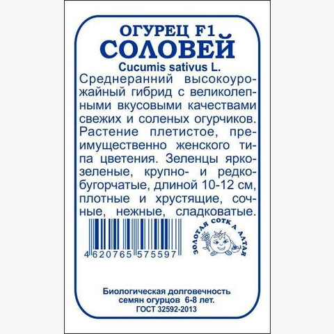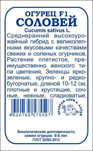 Среднеранний высокоурожайный гибрид с великолепными вкусовыми качествами свежих и соленых огурчиков. Растение плетистое, среднерослое, преимущественно женского типа цветения. Зеленцы крупно- и редкобугорчатые, веретеновидной формы, длиной 10-12 см, плотные и хрустящие, сочные, нежные и сладковатые. Гибрид характеризуется стабильной урожайностью и устойчивостью к комплексу заболеваний огурца.
