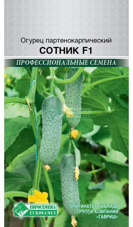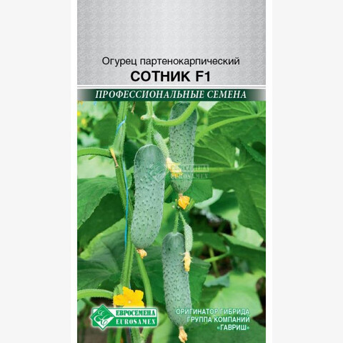 Огурец – ценный низкокалорийный продукт (14 ккал на 100 г). Витаминная составляющая овоща не очень выразительна. Большая часть ингредиентного состава приходится на воду (95 %), в которой находится природный адсорбент, впитывающий и выводящий яды из организма. Это натуральное очищающее вещество, по спектру действия напоминающее активированный уголь. Сотник -партенокарпический скороспелый гибрид для пленочных теплиц, летне-осеннего оборота. Период от всходов до получения плодов 40-42 дня. Плоды, длиной 10-12 см, массой 100-120 г, темно-зеленые с очень слабыми полосками до 1/4 длины плода, практически их не видно, часто бугорчатые, белошипые, цилиндрической формы. В узле 1-2 (до 4-х) завязей. Хороший рост, среднее ветвление. Ранняя отдача урожая. Отличительная особенность гибрида – сохранение цветочка на зеленцах, особенно на ранних стадиях, что придает зеленцам более привлекательный вид и что особенно нравится садоводам. Устойчив к настоящей мучнистой росе и оливковой пятнистости, толерантен к корневым гнилям.