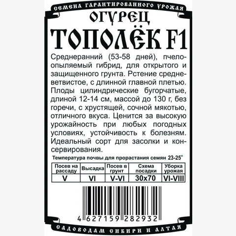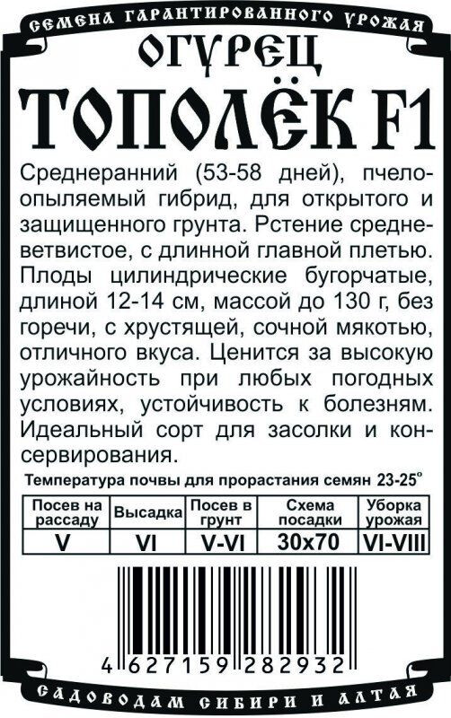 Среднеранний (53-58 дней), пчелоопыляемый гибрид, для открытого и защищенного грунта. Рстение средневетвистое, с длинной главной плетью. Плоды цилиндрические бугорчатые, длиной 12-14 см, массой до 130 г, без горечи, с хрустящей, сочной мякотью, отличного вкуса. Ценится за высокую урожайность при любых погодных условиях, устойчивость к болезням. Идеальный сорт для засолки и консервирования.