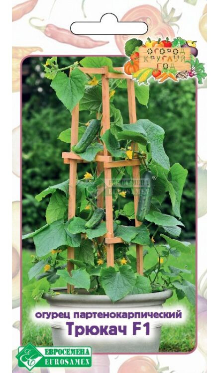 Каждая хозяйка хотела бы иметь свежую зелень в любое время года. Имея дачу или собственный огород можно баловать семью витаминными салатами на протяжении весенне-летнего периода. В зимнее же время нехватка витаминов и питательных веществ чувствуется особенно остро, поэтому все большей популярностью пользуются домашние мини-огороды на подоконниках и лоджиях, где любители земледелия умудряются вырастить почти весь дачный ассортимент овощей. Огород круглый год - модный тренд, занятие приятное и полезное, всегда под рукой пряная зелень к столу — и не нужно задумываться, как сохранить ее в свежем виде. Эта неторопливая работа по уходу за мини-огородом успокаивает, отвлекает от суеты и хлопот, к тому же растения создают особый микроклимат в помещениях, увлажняя сухой воздух и очищая его. Трюкач F1- раннеспелый компактный гибрид женского типа цветения для комнатной культуры. Плоды темно-зеленые, крупно бугорчатые, малошипые, длиной 8-10 см, массой 50-60 г, в узлах до 5 завязей, генетически без горечи, вкус отличный.