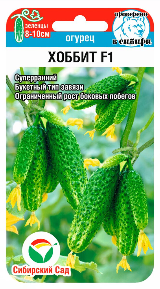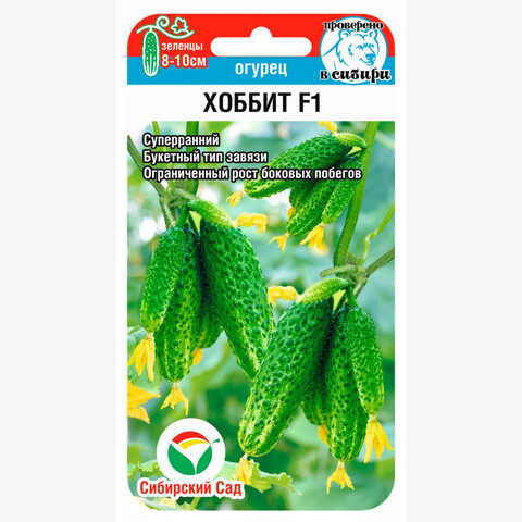 СУПЕРРАННИЙ, ВЫСОКОУРОЖАЙНЫЙ БУКЕТНЫЙ ТИП ЗАВЯЗИ ОГРАНИЧЕННЫЙ РОСТ БОКОВЫХ ПОБЕГОВ Супер ранний партенокарпический гибрид женского типа цветения с обильной букетной завязью, гарантирующий стабильные высокие урожаи красивых и вкусных зеленцов корнишонного типа в теплицах и открытом грунте. Растение с ограниченным типом ветвления, что облегчает формировку при выращивании на шпалере. В одном узле формируется 3-5 мелко - бугорчатых корнишона цилиндрической формы, длиной до 10 см, массой 80-90 г. Зеленцы цилиндрической формы, темно-зеленой окраски, с очень короткими полосами, мелкобугорчатые , с опушением и шипами. Благодаря плотной структуре, тонкой кожице и высокому содержанию сахаров обладают отличными вкусовыми качествами, отсутствие горечи обусловлено генетически. Огурчики хороши как для консервирования корнишонов длиной 5-9 см (соление и маринование), так и для потребления в свежем виде. Хоббит F1 устойчив к мучнистой росе, оливковой пятнистости, толерантен к корневым гнилям. Благодаря сильной завязываемости урожайность гибрида очень высокая - при выращивании в плёночных теплицах до 15 кг/м2. В открытом грунте растение не формируют. В теплицах выращивают на шпалере.
