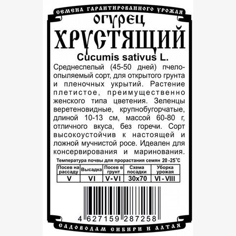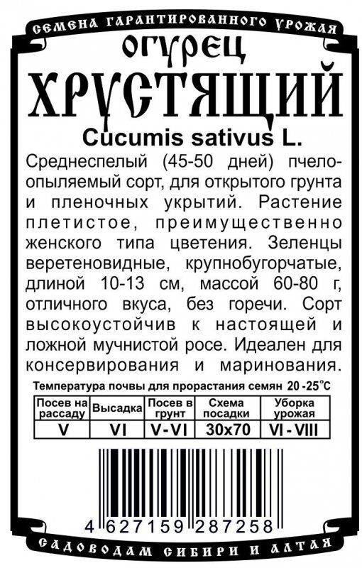 Среднеспелый (45-50 дней) пчелоопыляемый сорт, для открытого грунта и пленочных укрытий. Растение плетистое, преимущественно женского типа цветения. Зеленцы веретеновидные, крупнобугорчатые, длиной 10-13 см, массой 60-80 г, отличного вкуса, без горечи. Сорт высокоустойчив к настоящей и ложной мучнистой росе. Идеален для консервирования и маринования.