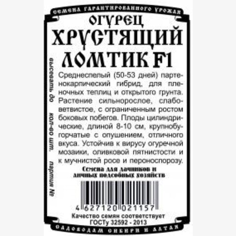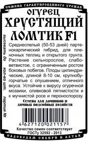Среднеспелый (50-53 дней) партенокарпический гибрид, для пленочных теплиц и открытого грунта. Растение сильнорослое, слабоветвистое, с ограниченным типом роста боковых побегов. Плоды цилиндрические, длиной 8-10 см, гладкие, с крупными бугорками, хрустящие, салатного назначения. Масса зеленца 90-100г. Устойчив к вирусу огуречной мозаики, оливковой пятнистости и толерантен к мучнистой росе и пероноспорозу.