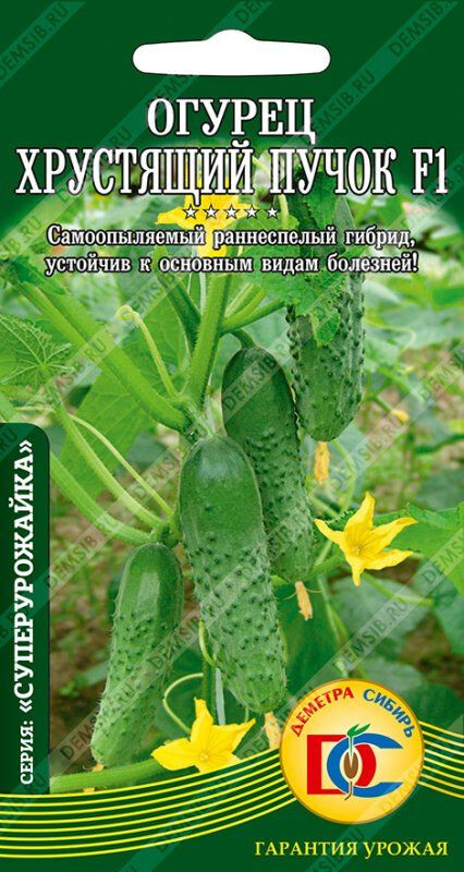 Раннеспелый (44-54 дней) партенокарпический, урожайный гибрид, для окрытого и закрытого грунта. Растения индетерминантные, среднерослые, среднеплетистые, женского типа цветения, число женских цветков в узле 1-3. Зеленец цилиндрической формы, темно-зеленый, крупнобугорчатый, с легким белым опушением, короткоплодный, длиной 7-11см, массой 95-105 г. Очень вкусный как в свежем виде, так и в консервировании. Устойчив к вирусу огуречной мозаики, кладоспориозу, мучнистой и ложной мучнистой росе. Ценится за раннеспелость, высокий урожай короткоплодной товарной продукции, универсальное использование.