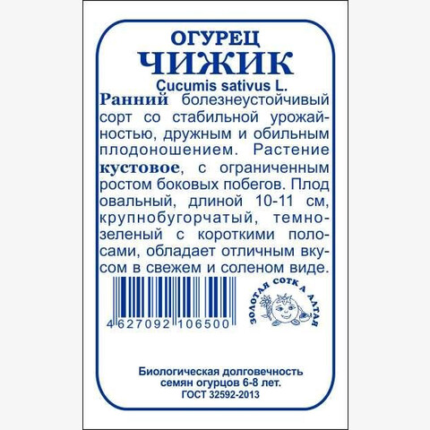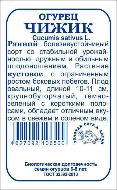 Ранний болезнеустойчивый сорт со стабильной урожайностью, дружным и обильным плодоношением. Растение кустовое, с ограниченным ростом боковых побегов. Плод овальный, длиной 10-11 см, крупнобугорчатый, темно-зеленый с короткими полосами, обладает отличным вкусом в свежем и соленом виде.