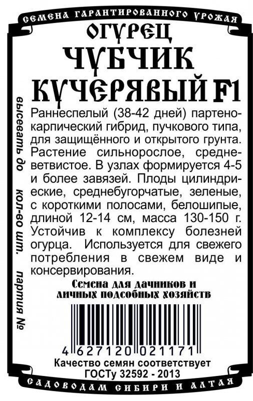 Раннеспелый (38-42 дня) партенокарпический гибрид (R), для защищённого и открытого грунта. Растение сильнорослое, средневетвистое, В узле формируется 4-5 завязей, а на боковых побегах до 8. Плоды цилиндрические, среднебугорчатые, зеленые, с короткими полосами, белошипые, длиной 12-14 см, диаметром 3,5-4 см. Масса 130-150 г. Устойчив к комплексу болезней огурца. Используется для свежего потребления и маринования.