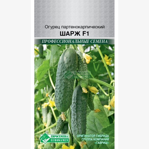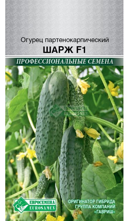 Огурец – ценный низкокалорийный продукт (14 ккал на 100 г). Витаминная составляющая овоща не очень выразительна. Большая часть ингредиентного состава приходится на воду (95 %), в которой находится природный адсорбент, впитывающий и выводящий яды из организма. Это натуральное очищающее вещество, по спектру действия напоминающее активированный уголь. Шарж- партенокарпический гибрид огурца женского типа цветения, в узле до 5 завязей. Зеленцы длиной 13-15 см, цилиндрической формы, темно-зеленого цвета со светлыми полосками до ¼ длины плодов. Бугорки среднего размера, расположены часто. Гибрид устойчив к настоящей мучнистой росе, оливковой пятнистости и корневым гнилям, толерантен к пероноспорозу, отлично транспортируется на дальние расстояния.