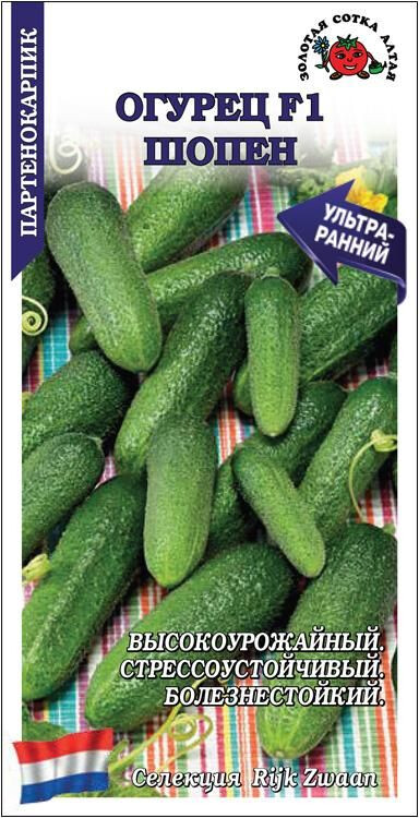 Гибрид ультраранний, партенокарпический, рекомендуется для выращивания в открытом грунте врастил и в теплицах. Растение средневетвистое, женского типа цветения. Корнишоны темно-зеленые, цилиндрической формы, мелкобугорчатые, коротенькие, массой 55-92 г, плотные и сочные, очень вкусные и ароматные. Гибрид высокоурожайный и стрессоустойчивый, устойчив к заболеваниям. Используется в свежем виде, для засола и маринования.