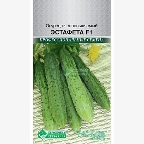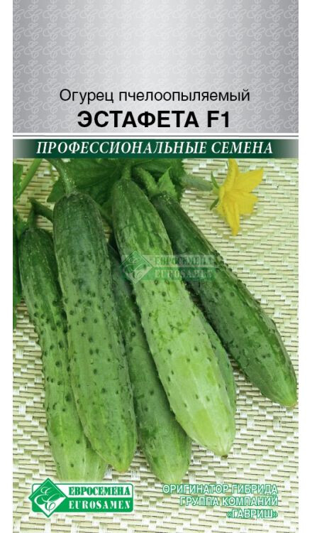 Огурец – ценный низкокалорийный продукт (14 ккал на 100 г). Витаминная составляющая овоща не очень выразительна. Большая часть ингредиентного состава приходится на воду (95 %), в которой находится природный адсорбент, впитывающий и выводящий яды из организма. Это натуральное очищающее вещество, по спектру действия напоминающее активированный уголь. Эстафета- среднеспелый пчелоопыляемый гибрид (50-55 дня от всходов до плодоношения) с хорошим ростом, средним ветвлением, смешанного типа цветения. Плоды салатного назначения, вкусные, хрустящие, длиной 18-20 см, цилиндрические, с небольшим сбегом или плавной ручкой, темно-зеленые со светлыми полосками до 1/3 длины плода, белошипые. Бугорки крупные, расположены редко. В узле по 1-2 завязи. Отличается устойчивостью к пониженной освещенности, к корневым гнилям, толерантен к настоящей мучнистой росе и аскохитозу. IR: Foc, Asc.
