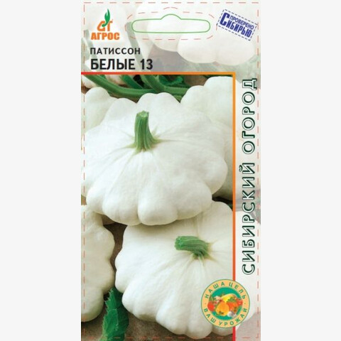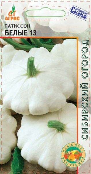 Среднеспелый сорт. На кустовом, ветвящемся растении формируются крупные (массой 400-500 г), белые плоды дисковидной формы, с округло-зубчатыми краями. Мякоть плотная, белая, отличного вкуса. ПАТИССОН БЕЛЫЕ 13 хорош для консервирования и использования в домашней кулинарии. Особенности выращивания: полив теплой водой редкий, но обильный. Рыхление и прополка в течение вегетации. - - V-VI - 70x70 VII-VIII