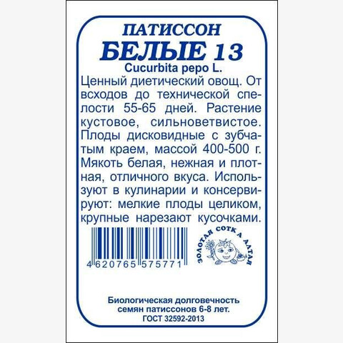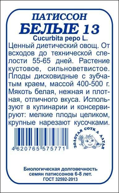 Ценный диетический овощ. От всходов до технической спелости 55-65дней. Растение кустового типа, сильноветвистое. Плоды дисковидные с зубчатым краем, среднего размера, массой до 400-500 г. Мякоть белая, нежная, плотная, отличных вкусовых качеств. Сорт используется в кулинарии, мелкие плоды прекрасно подходят для цельноплодного консервирования, крупные – для консервирования кусочками.