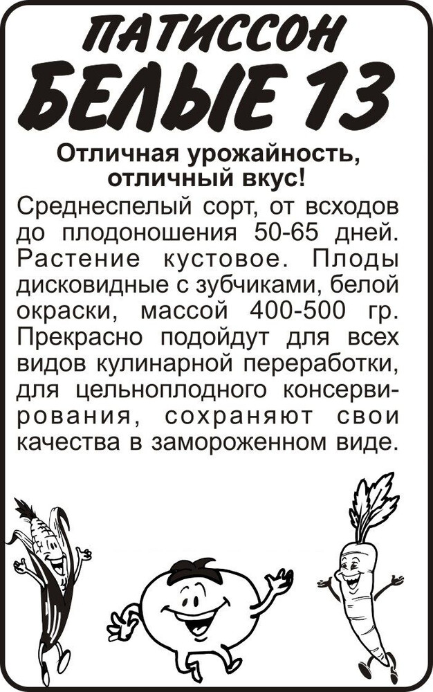Среднеспелый сорт, от всходов до плодоношения 50-65 дней. Растение кустовое. Плоды дисковидные, с зубчиками, белой окраски, массой 400-500 г. Прекрасно подойдут для всех видов кулинарной переработки, для цельноплодного консервирования, сохраняют свои качества в замороженном виде. Место посадки: легкие плодородные нейтральные почвы. Лучшими предшественниками являются крестоцветные (разные виды капусты), пасленовые Освещение: освещенные участки, хорошо переносят затенение Предпосевная подготовка: не требуется. Для улучшения всхожести выбирают семена возрастом 3-5 лет, замачивают в 1% растворе марганцовки на 15 минут Сроки посева: при прогревании почвы до 12-15 °C. Растение не переносит заморозков Посев на рассаду: за 25-30 дней до высадки. Посев проводят в рассадные емкости 0,5 л в рыхлый, плодородный грунт. Семена заделывают в почву на глубину 2,5-3 см, обильно увлажняют и накрывают пленкой до появления всходов. Готовая к высадке рассада должна иметь 4-5 настоящих листьев Посев в грунт: посев проводят, когда почва прогреется до 10-12°C (апрель-июнь). В лунку насыпают перегной, который немного присыпают землей, укладывают 2-3 семени и засыпают торфоземляной смесью. Посадочный интервал 60х60 см. Глубина заделки семян — 4-5 см Пикировка/перевалка: рассаду закаливают, высадку проводят при среднесуточной температуре не ниже 15°C. Растения высаживают без повреждения земляного кома на высоту корневой шейки, без заглубления. Первые 3-5 дней притеняют Уход: не требует формирования. Хорошо отзывается на мульчирование почвы вокруг растений свежескошенной травой и 1-2 подкормки органическими удобрениями Сбор урожая: проводится выборочно, по мере достижения плодами технической зрелости, когда их размер достигнет 6-10 см в диаметре для консервации и 10-12 см для приготовления рагу, икры, фарширования