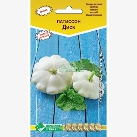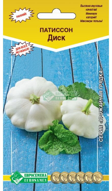 Увидев патиссон впервые, можно подумать, что это маленькая недозрелая тыква. Отчасти это правда. Этот овощ является разновидностью тыкв. По вкусовым качествам он напоминает кабачок. Патиссоны часто называют солнечным кабачком (из-за схожести вкусовых качеств) и тарельчатой тыквой. Впервые этот полезный овощ появился в 17 веке, сейчас тарельчатые тыквы культивируют практически во всем мире, ведь они являются полезными для человеческого организма. Окраска плодов настолько разнообразна, что, порой, выбор становится проблематичным. Диск- раннеспелый сорт универсального назначения. Вегетационный период 55-75 дней. Урожайность более 3 кг плодов с растения. Растение кустовое, плод дисковидный, со слабо выраженной зубчатостью по краю, гладкий, белый, без рисунка и сетки. Кора тонкая, деревянистая. Мякоть белая, хрустящая, малосочная, несладкая. Масса плода в технической спелости 250 г. Плоды патиссона содержат витамины С, В1, В2, РР, пектиновые вещества и очень полезны при малокровии, гипертонии, болезнях почек.