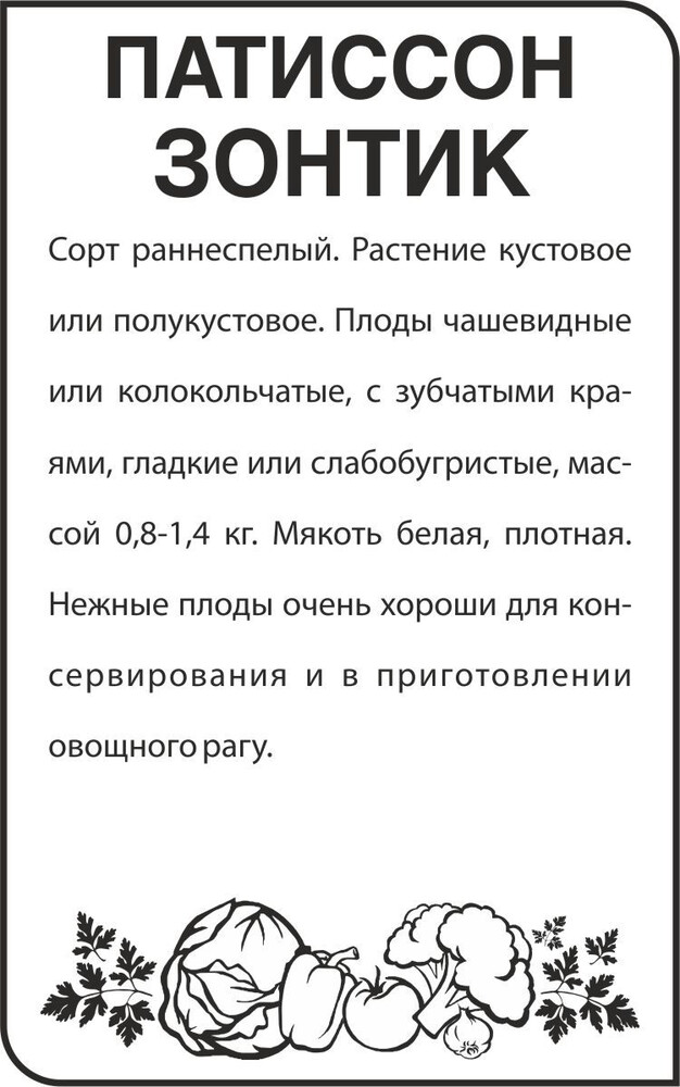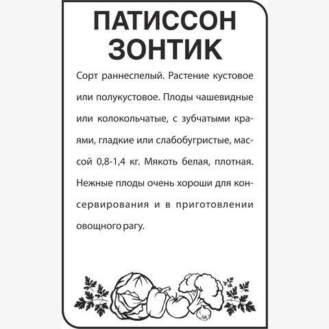 Сорт раннеспелый. Растение кустовое или полукустовое. Плоды чашевидные или колокольчатые, с зубчатыми краями, гладкие или слабобугристые, массой 0,8-1,4 кг. Мякоть белая, плотная. Нежные плоды очень хороши для консервирования и в приготовлении овощного рагу. Место посадки: легкие плодородные нейтральные почвы. Лучшими предшественниками являются крестоцветные (разные виды капусты), пасленовые Освещение: освещенные участки, хорошо переносят затенение Предпосевная подготовка: не требуется. Для улучшения всхожести выбирают семена возрастом 3-5 лет, замачивают в 1% растворе марганцовки на 15 минут Сроки посева: при прогревании почвы до 12-15 °C. Растение не переносит заморозков Посев на рассаду: за 25-30 дней до высадки. Посев проводят в рассадные емкости 0,5 л в рыхлый, плодородный грунт. Семена заделывают в почву на глубину 2,5-3 см, обильно увлажняют и накрывают пленкой до появления всходов. Готовая к высадке рассада должна иметь 4-5 настоящих листьев Посев в грунт: посев проводят, когда почва прогреется до 10-12°C (апрель-июнь). В лунку насыпают перегной, который немного присыпают землей, укладывают 2-3 семени и засыпают торфоземляной смесью. Посадочный интервал 60х60 см. Глубина заделки семян — 4-5 см Пикировка/перевалка: рассаду закаливают, высадку проводят при среднесуточной температуре не ниже 15°C. Растения высаживают без повреждения земляного кома на высоту корневой шейки, без заглубления. Первые 3-5 дней притеняют Уход: не требует формирования. Хорошо отзывается на мульчирование почвы вокруг растений свежескошенной травой и 1-2 подкормки органическими удобрениями Сбор урожая: проводится выборочно, по мере достижения плодами технической зрелости, когда их размер достигнет 6-10 см в диаметре для консервации и 10-12 см для приготовления рагу, икры, фарширования