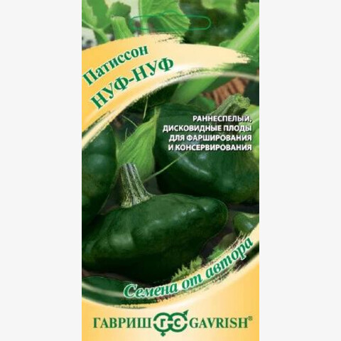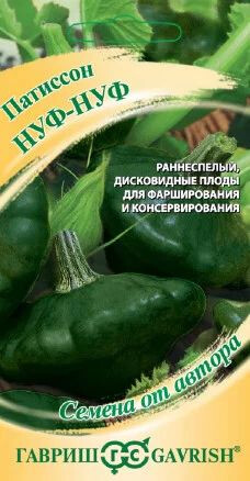 Патиссоны привлекают внимание декоративным видом плодов. Как и ближайшие родственники культуры — тыквы и кабачки — не доставляют особых хлопот на протяжении всего сезона выращивания. В них содержится огромное количество сахаров, углеводов, жиров, минеральных солей и пектиновых веществ. Экзотический овощ может стать интересным дополнением для самых разных блюд. При консервировании молодых патиссончиков в банках красиво смотрится вместе с сортами Наф-наф и Ниф-ниф. Сочные плоды фаршируют, жарят, тушат, запекают и маринуют. Раннеспелый сорт Нуф-Нуф будет радовать готовыми плодами через 40-60 дней, окраска которых меняется от зеленой до темно-зеленой, почти черной. Патиссоны дисковидной формы, с зубчатыми краями, диаметром 16-18 см, с повышенным содержанием аскорбиновой кислоты (витамина С). Растение кустовое, не ветвящееся. Посев на рассаду — в апреле, высадка в грунт — в мае-июне. Посев непосредственно в грунт — в конце мая-начале июня. Хорошо отзывается на внесение органических удобрений.