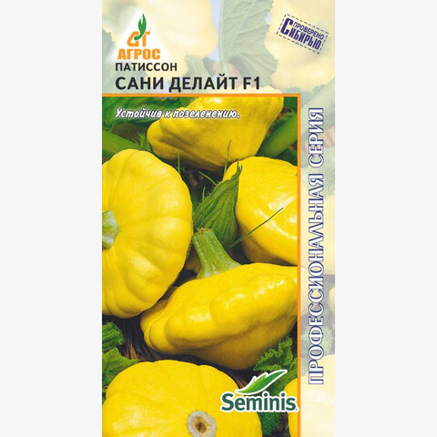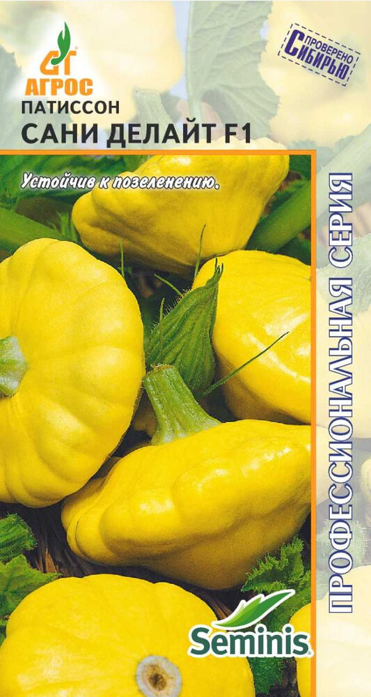 Очень ранний, высокопродуктивный гибрид. Растение кустовое, компактное. Плоды блестящие, золотисто-желтые, тарелочной формы, диаметром 6 - 8 см, массой до 100 г, более устойчивы к позеленению, чем плоды других гибридов; они дольше сохраняют товарный вид, как на растении, так и после уборки. САНИ ДЕЛАЙТ F1 - идеален для приготовления различных блюд домашней кулинарии и для консервирования.