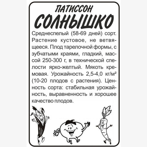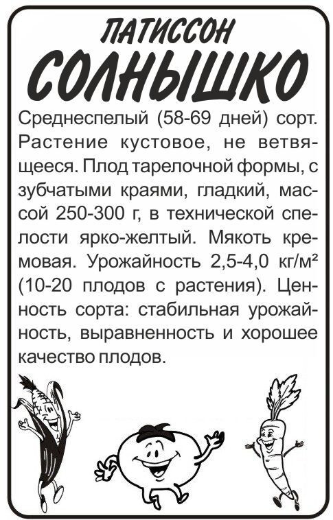 • Среднеспелый (58-69 дней) сорт. Растение кустовое, не ветвящееся. Плод тарелочной формы, с зубчатыми краями, гладкий, массой 250-300 г, в технической спелости ярко-желтый. Мякоть кремовая. Урожайность 2,5-4,0 кг/кв.м (10-20 плодов с растения). Ценность сорта: стабильная урожайность, выравненность и хорошее качество плодов. Место посадки: легкие плодородные нейтральные почвы. Лучшими предшественниками являются крестоцветные (разные виды капусты), пасленовые Освещение: освещенные участки, хорошо переносят затенение Предпосевная подготовка: не требуется. Для улучшения всхожести выбирают семена возрастом 3-5 лет, замачивают в 1% растворе марганцовки на 15 минут Сроки посева: при прогревании почвы до 12-15 °C. Растение не переносит заморозков Посев на рассаду: за 25-30 дней до высадки. Посев проводят в рассадные емкости 0,5 л в рыхлый, плодородный грунт. Семена заделывают в почву на глубину 2,5-3 см, обильно увлажняют и накрывают пленкой до появления всходов. Готовая к высадке рассада должна иметь 4-5 настоящих листьев Посев в грунт: посев проводят, когда почва прогреется до 10-12°C (апрель-июнь). В лунку насыпают перегной, который немного присыпают землей, укладывают 2-3 семени и засыпают торфоземляной смесью. Посадочный интервал 60х60 см. Глубина заделки семян — 4-5 см Пикировка/перевалка: рассаду закаливают, высадку проводят при среднесуточной температуре не ниже 15°C. Растения высаживают без повреждения земляного кома на высоту корневой шейки, без заглубления. Первые 3-5 дней притеняют Уход: не требует формирования. Хорошо отзывается на мульчирование почвы вокруг растений свежескошенной травой и 1-2 подкормки органическими удобрениями Сбор урожая: проводится выборочно, по мере достижения плодами технической зрелости, когда их размер достигнет 6-10 см в диаметре для консервации и 10-12 см для приготовления рагу, икры, фарширования