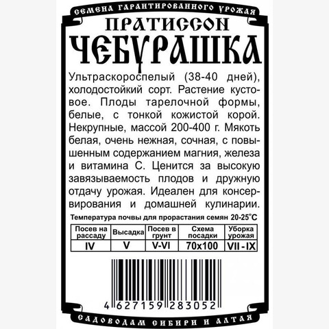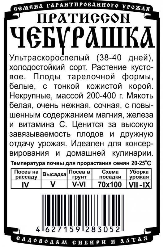 Ультраскороспелый (38-40 дней), холодостойкий сорт. Растение кустовое. Плоды тарелочной формы, белые, с тонкой кожистой корой. Некрупные, массой 200-400г. Мякоть белая, очень нежная, сочная, с повышенным содержанием магния, железа и витамина С. Ценится за высокую завязываемость плодов и дружную отдачу урожая. Идеален для консервирования и домашней кулинарии.
