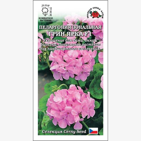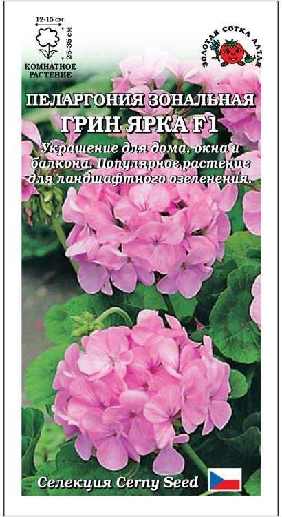 Серия Грин отличается ранним и обильным цветением. Кустик компактный, диаметром около 25 см. Листья выразительные, зеленые с коричневыми краями. Простые цветки светло-розовой окраски с переходом в карминно-розовую собраны в плотные шаровидные или полушаровидные соцветия. Пеларгония придает нарядный вид окнам, балконам и лоджиям. Используется в ландшафтном озеленении.
