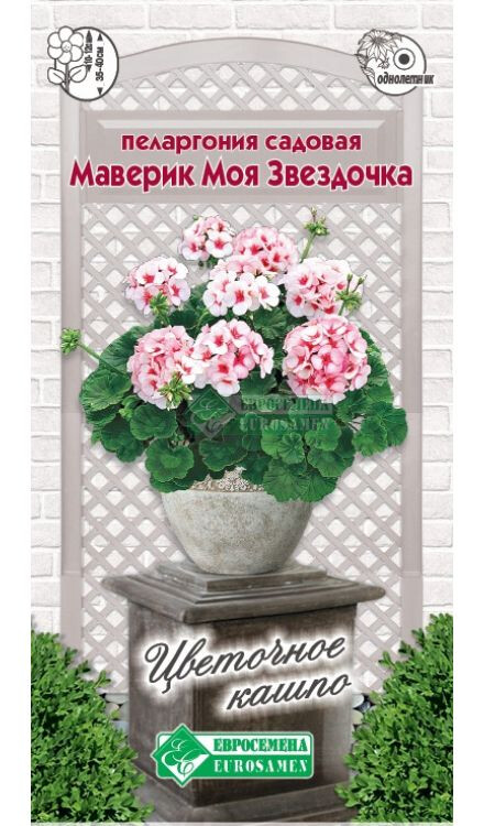 Серия пеларгонии садовой Маверик - это мощная, хорошо ветвящаяся герань премиум класса с красивыми зелеными листьями и соцветиями в виде больших шаров плотных цветков самых ярких разнообразных окрасок. Растение высотой 30-35 см, серия специально предназначена для выращивания в горшках. Отличается повышенной однородностью и необыкновенной обильностью цветения. Моя Звездочка- герань с очень нежной окраской цветков, в которых идеально сочетаются белый и нежно-розовый цвета, а соцветия достигают в диаметре 10- 12 см. Двухцветные цветки на компактных, не вытянутых цветоносах необычайно эффектны и привлекательны. Круглые листья с необыкновенной окраской придают ей еще больше шарма. Широко применяется для выращивания в горшках, вазонах, клумбах открытого грунта, будет играть солирующую роль яркого пятна в любом уголке сада.