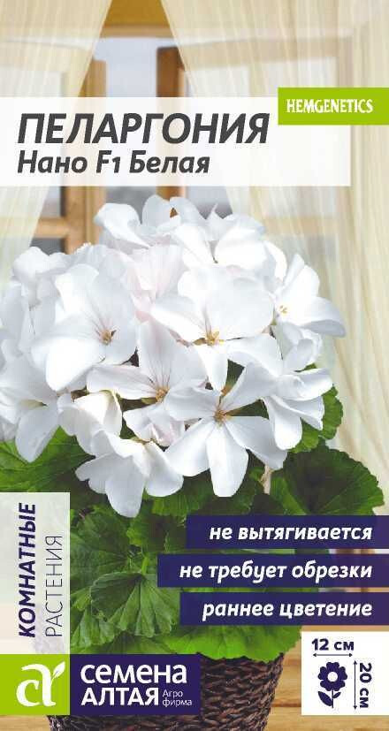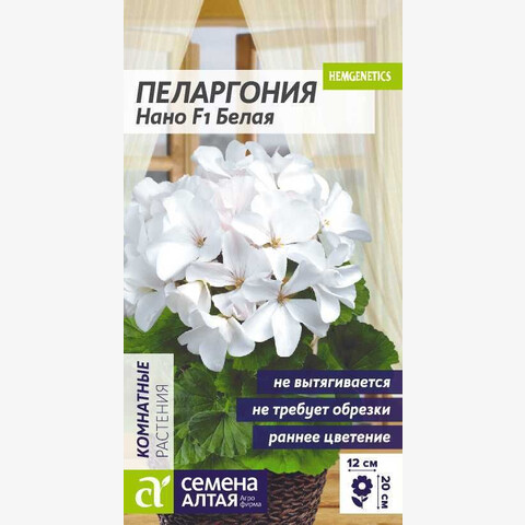 Уникальная генетически карликовая пеларгония. Не требует прищипывания и формировки. Формирует множество крупных белоснежных шапок соцветий на коротких цветоносах. Массовые посадки образуют сплошной цветущий ковер. Широко используется в озеленении лоджий, веранд, балконов, в бордюрных посадках, в качестве комнатного растения выращивается как многолетник. Характеризуется ранним цветением. Высота растения: 18-20 см Ширина куста: 20-25 см Диаметр соцветия: 10-12 см Условия выращивания, место посадки: хорошо освещенные места Требования к грунту: питательный легкий грунт с нейтральной кислотностью Способы выращивания: рассадный Время посева на рассаду: январь-март Способ посева: семена высевают на уплотненное ложе замоченных в горячей воде и заряженных питанием торфяных таблеток или увлажненного питательного грунта, заделывая на глубину 0,2-0,3 см или присыпая вермикулитом. Емкость накрывают прозрачной крышкой или пленкой до появления первых всходов, периодически проветривают. Оптимальная температура +21…23°С, не выше +25°С во избежание вытягивания. После появления первых всходов рекомендуется организовать досветку 10-12 часов в сутки, снизить температуру до +18…20°С. Время до появления всходов: 5-7 дней Перевалка: производится в стадии 2-4 настоящих листьев в рассадные емкости диаметром около 9 см, около 5-6 недели после посева. Последующие перевалки осуществляются по мере роста корневой системы. Время высадки в открытый грунт: май-июнь, не менее 10-11 недели от посева Посадочное расстояние: 25-35 см Период цветения: май-октябрь, с 8-10 недели от полных всходов Уход: при недостатке освещенности проводить досветку фитолампами для более раннего и активного цветения. При поливе чередовать циклы увлажнения с подсушиванием субстрата, не допускать переувлажнения. Удалять увядшие соцветия. Подкормки проводят раз в две недели комплексным минеральным удобрением с микроэлементами. Культура требовательна к кальцию и железу. В открытом грунте требует профилактических обработок против грибковых заболеваний.