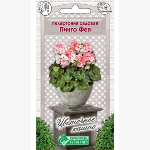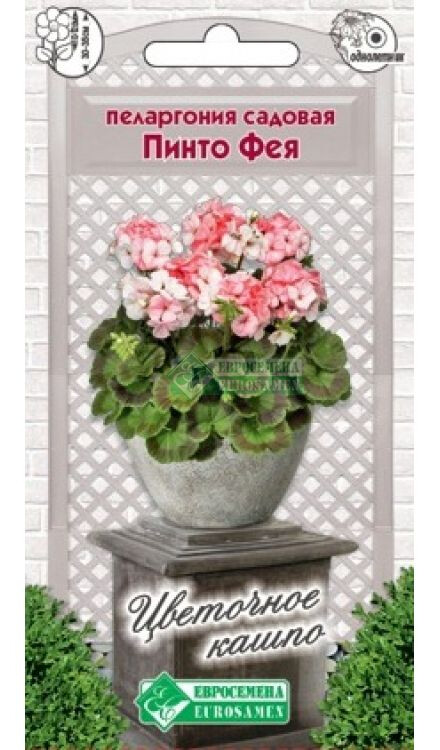 Серия пеларгонии садовой Пинто- это мощная, хорошо ветвящаяся пеларгония премиум класса. Растение высотой 30-35 см с цветками, собранными в соцветия в виде больших шаров плотных цветков самых разнообразных расцветок на компактных, не вытянутых цветоносах. Серия специально предназначена для выращивания в горшках. Отличается повышенной однородностью и необыкновенной обильностью цветения. Пинто Фея- герань с новой, уникальной бело-розовой окраской, награжденная золотой медалью Fleuroselect. Нежные цветки, собранные в шаровидные соцветия диаметром в 10-12 см необычайно эффектны и привлекательны. Красивые круглые листья с сильно-волнистым краем придают ей еще большее очарование. Широко применяется для выращивания в горшках, вазонах, клумбах открытого грунта, привнесет в любой уголок сада нежность и обаяние.