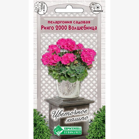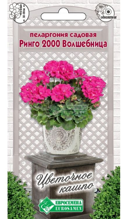 Серия пеларгонии садовой Ринго 2000 - это мощная, хорошо ветвящаяся герань премиум класса с красивыми листьями, отмеченными коричневой кольцевой зоной и соцветиями в виде больших шаров плотных цветков самых ярких разнообразных окрасок. Растение высотой 30-35 см, серия специально предназначена для выращивания в горшках. Отличается повышенной однородностью и необыкновенной обильностью цветения. Ринго 2000 Волшебница- герань с очень насыщенной, ярко фиолетовой окраской, соцветия которой достигают в диаметре 10- 12 см. Фиолетовые цветки на компактных, не вытянутых цветоносах необычайно эффектны и привлекательны. Круглые листья с необыкновенной окраской придают ей еще больше шарма. Широко применяется для выращивания в горшках, вазонах, клумбах открытого грунта, будет играть солирующую роль яркого пятна в любом уголке сада.