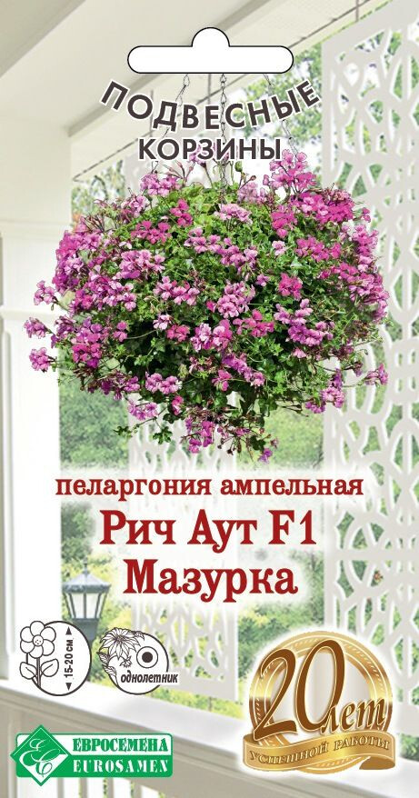 • Рич Аут- совершенно новая ампельная пеларгония профессионального уровня из семян. Благодаря своей компактной форме и коротким междоузлиям ее легко выращивать. Она не образует рыхлого растения с длинными хрупкими побегами, а формирует без обрезки очень плотный куст шаровидной формы, разрастаясь до 45-50 см в диаметре. Растение обладает жесткими листьями и прочными побегами – что делает его устойчивым к ветру и дождям. Цветение обильное и продолжительное до глубокой осени, на кустиках постоянно появляются новые бутоны, расцветающие самыми разнообразными окрасками. Она ценится за неприхотливость в уходе, продолжительность и яркость цветения. Декоративными качествами обладают не только цветы, но и листья растения. Широко используется для создания подвесных корзин и балконных ящиков, для высоких вазонов и кашпо. Рекомендуется выращивать на хорошо освещенном месте.