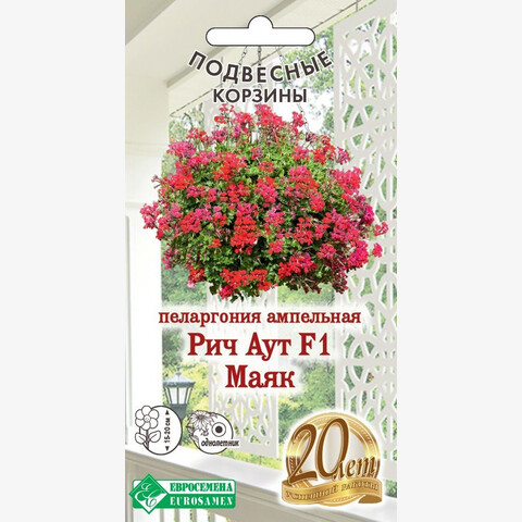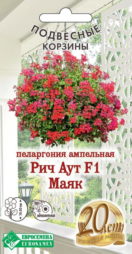 Рич Аут- совершенно новая ампельная пеларгония профессионального уровня из семян. Благодаря своей компактной форме и коротким междоузлиям ее легко выращивать. Она не образует рыхлого растения с длинными хрупкими побегами, а формирует без обрезки очень плотный куст шаровидной формы, разрастаясь до 45-50 см в диаметре. Растение обладает жесткими листьями и прочными побегами – что делает его устойчивым к ветру и дождям. Цветение обильное и продолжительное до глубокой осени, на кустиках постоянно появляются новые бутоны, расцветающие самыми разнообразными окрасками. Она ценится за неприхотливость в уходе, продолжительность и яркость цветения. Декоративными качествами обладают не только цветы, но и листья растения. Широко используется для создания подвесных корзин и балконных ящиков, для высоких вазонов и кашпо. Рекомендуется выращивать на хорошо освещенном месте.