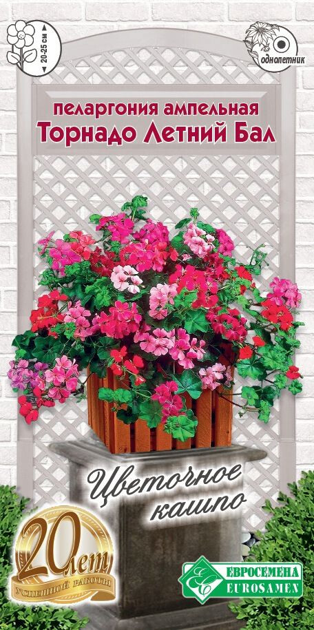 Торнадо - миниатюрная плющелистная (ампельная) пеларгония с невысоким ростом и длиной побегов до 45-60 см, отличающаяся пышным, аккуратным кустиком, обильнейшим цветением и хорошим ветвлением. Зацветает намного раньше других гибридов. Она ценится за неприхотливость в уходе, продолжительность и яркость цветения. Декоративными качествами обладают не только цветы, но и листья растения. Цветы - "бабочки" окрашены в яркие цвета, на верхних лепестках темно-бордовые лучики и капли. Листва темно-зеленая гофрированная с ярким бронзовым "глазком". Один из самых лучших сортов среди ампельных пеларгоний, пригодных для быстрого и красивого оформления балконных ящиков и подвесных корзин. Для создания красивых корзин и балконных ящиков не требуется прищипка и практически не нужны регуляторы роста.