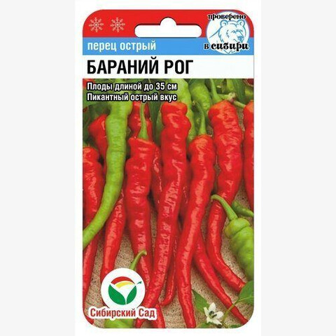 Высокоурожайный среднеранний сорт для открытого грунта ипленочных укрытий. В открытом грунте период от всходов до начала созревания - 130-145 дней, в пленочных теплицах - 110- 120 дней. Высота куста в открытом грунте - 50-60 см, в пленочных укрытиях до 1 м. Куст сомкнутый, не требует формирования. Плоды пониклые, узкоконусовидные, очень длинные (20-35 см), слабоморщинистые, скручены по спирали и похожи на бараний рог. Диаметр плодов 1-1,5 см, масса 30-36 г. Окраска зеленая в технической спелости, в биологической — красная. Перцы имеют пикантный острый вкус и сильный аромат. Рекомендуется для использования в виде приправы к блюдам, в качестве специй при квашении, мариновании и консервации. При консервации семена не удаляют. Урожайность под пленочным укрытием 3 кг/м2. Выращивают через рассаду. Семена высевают в феврале - начале марта на глубину 1-1,5 см при температуре 23-25 °С. Высадка рассады в открытый грунт после угрозы заморозков. Схема посадки 50х30 см. Уход состоит в рыхлении, регулярном поливе и подкормках.