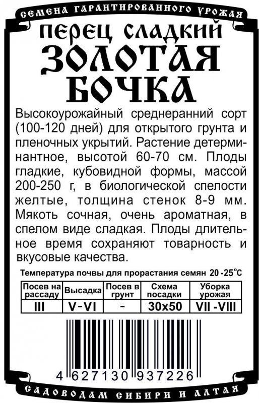 Высокоурожайный среднеранний сорт (100-120 дней) для открытого грунта и пленочных укрытий. Растение детерминантное, высотой 60-70 см. Плоды гладкие, кубовидной формы, массой 200-250 г, в биологической спелости желтые, толщина стенок 8-9 мм. Мякоть сочная, очень ароматная, в спелом виде сладкая. Плоды длительное время сохраняют товарность и вкусовые качества.
