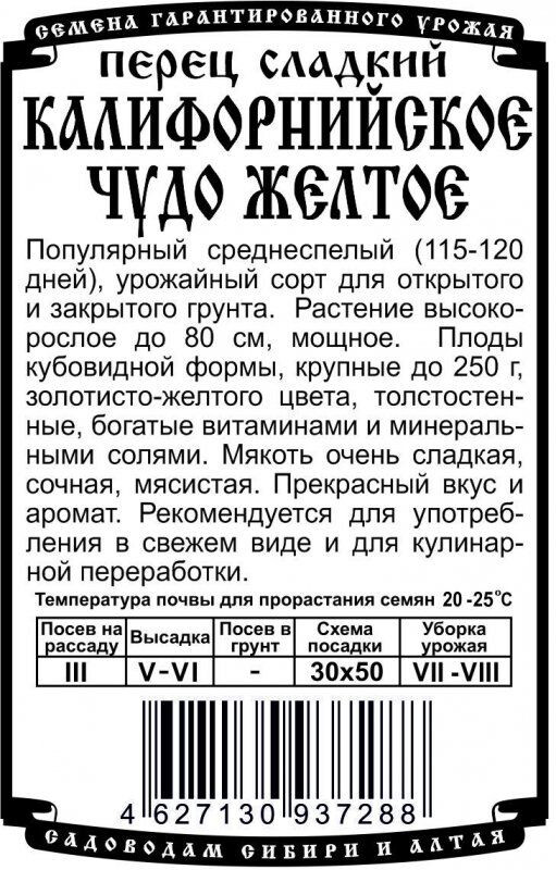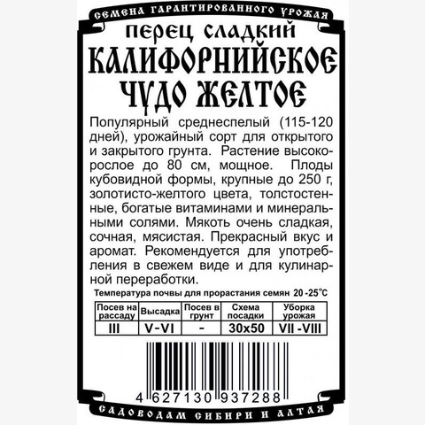 Популярный среднеспелый (115-120 дней), урожайный сорт для открытого и закрытого грунта. Растение высокорослое до 80 см, мощное. Плоды кубовидной формы, крупные до 250 г, золотисто-желтого цвета, толстостенные, богатые витаминами и минеральными солями. Мякоть очень сладкая, сочная, мясистая. Прекрасный вкус и аромат. Рекомендуется для употребления в свежем виде и для кулинарной переработки.